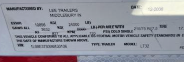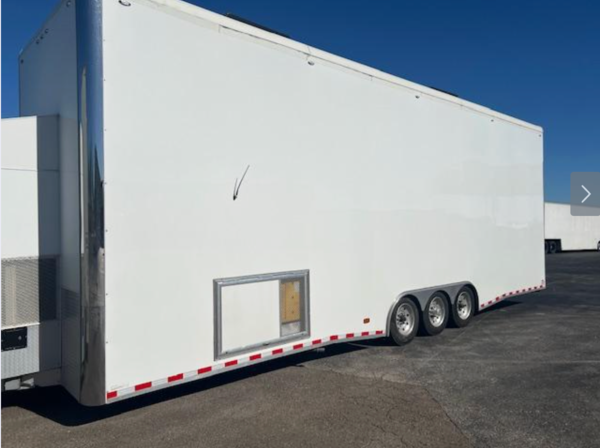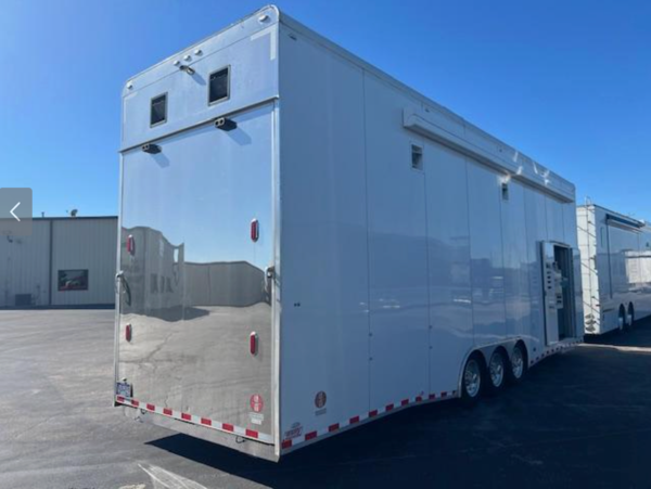 2009 Lee Trailers 32' Stacker tag, Triple 8K Axels, 17.5 Aluminum Wheels & Tires, Spare Aluminum Wheel & Tire, 12KW Power tech Diesel Generator, Hydraulic Tongue jack, Central A/C, 110/12 Volt Lighty & Wire Package, 15' Gemini 6,000lb Rated Interior Lift W/Drop In Center Fillers, Upper Loft Area 56" Tall x 11' Long, Lots of Aluminum Cabinets, Cabinet & Woek Bench package, Sliding Glass Doors at Double Side Door Entrance, Outside Pit Lights, Power Awnings, Slide Out Aluminum Side Door Step, Observation Deck, Roof Access Hatch Inside Trailer,